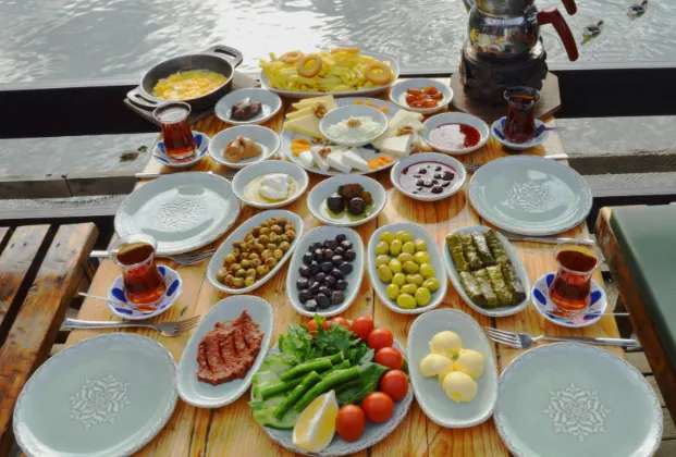 "Bal,kaymak,tereyağ,sigara böreği,kaşar peniri,patates tava,köy peyniri,reçel,salatalık,domates,sahanda yumurta,siyah zeytin,yeşil zeytin,siyah erik,roka, maydanoz,biber"